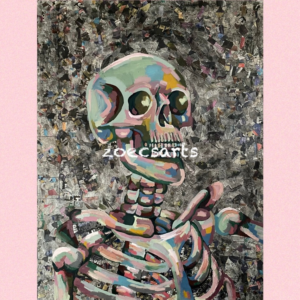 ‘SKELETON’ is my original abstract skeleton oil painting with a newspaper background.